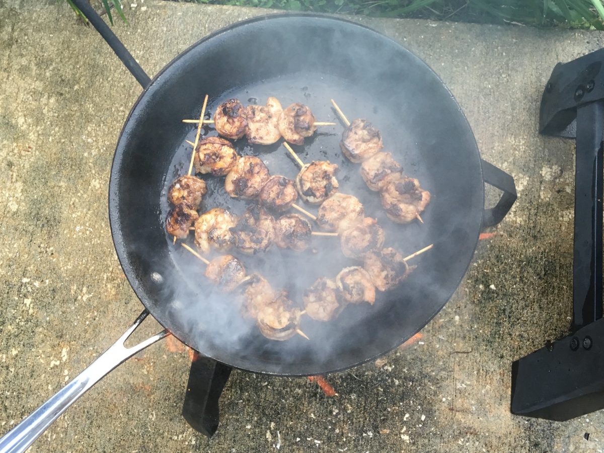 Over outdoor gas burner, heat well-seasoned cast iron skillet. You cannot get the skillet too hot. Once the skillet is smoking, add 1 Tablespoon of the butter, and swirl around in the pan. Immediately add the shrimp skewers. (The butter may flame up, so be careful!) Cook 1 to 2 minutes, shaking the pan to distribute the heat.