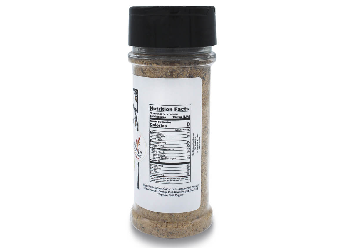 Ingredients: Onion, Garlic, Salt, Lemon Peel, Natural Lime Powder, Orange Peel, Black Pepper, Smoked Paprika, Datil Peppers
